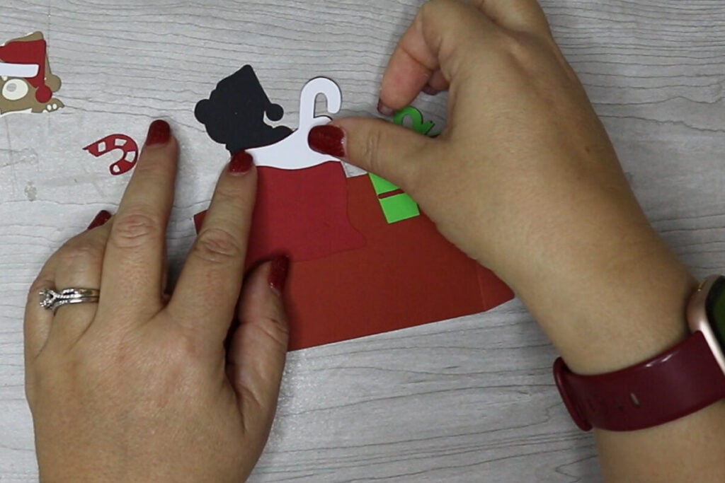 To attach the box card together, place the Santa layer on top of the fireplace layer upside down. Lay the tab piece down flat and line the outside up with the score line on the fireplace layer. You also want to line this up with the bottom. While holding this in place, fold the tab piece up, add glue and then press this back down to attach.