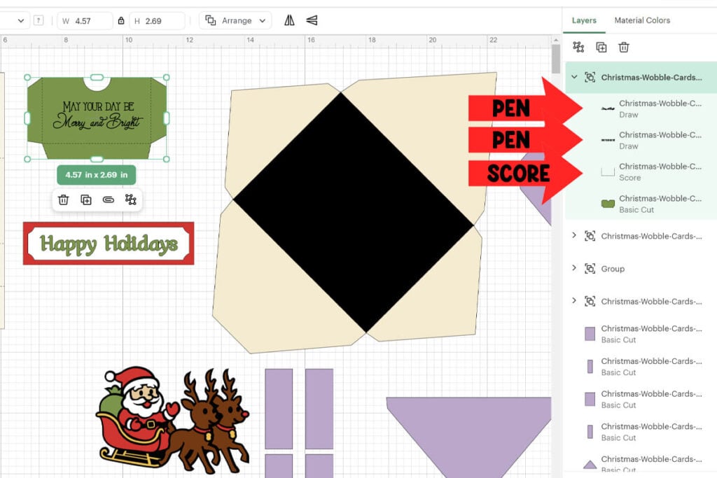 You don’t need to cut everything out in the file. Decide if you want the Santa design, penguin or elf and delete the others. If you want to make all 3, just make sure to duplicate the card layers so you have additional card pieces to go with them.