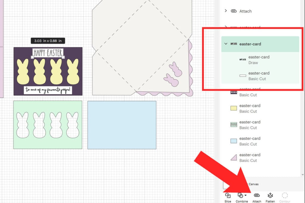 Then, attach each of the pen layers to the white rectangle underneath it. So select Happy Easter and the white rectangle together, and select “Attach”. Repeat this for the other pen layer.