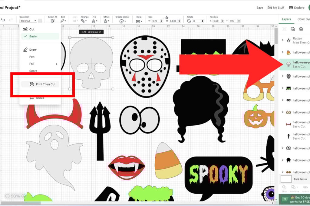 To make layered Halloween Photo Booth Props, start by uploading the SVG file to Cricut Design Space. For help with uploading SVG files, check out my tutorial here.