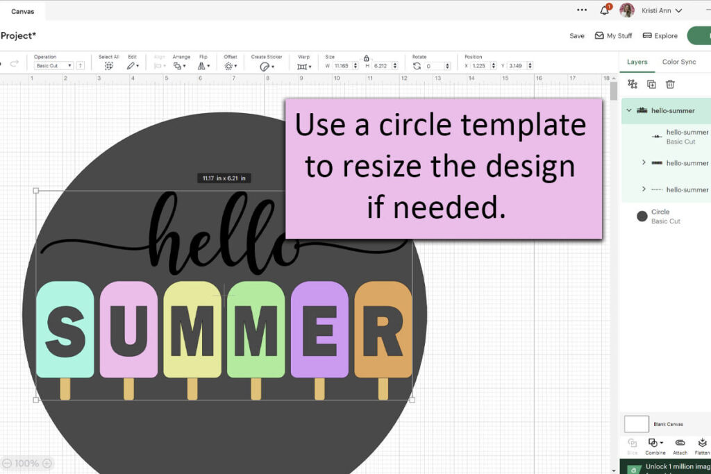 Note: If your wood round is a different size than 16″x16″, then you will need to resize the design first. To do this, add a circle to your canvas and change the size to the size of your wood round. Send the circle layer to the back. Then, resize the design until it fits and delete the circle before cutting.