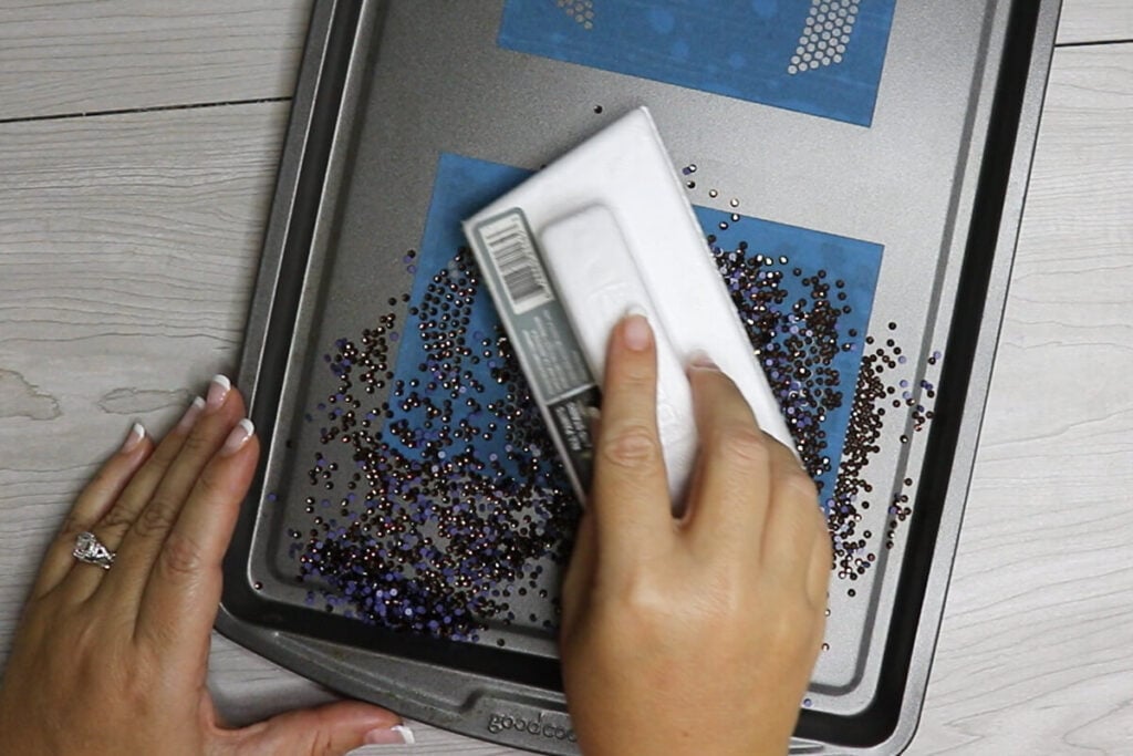 Pour a generous amount of rhinestones over the rhinestone template. Using a paint trimmer brush, brush in circular motions to help the rhinestones fall into their places. Continue to do this until all the spaces are filled and brush away the extra rhinestones.